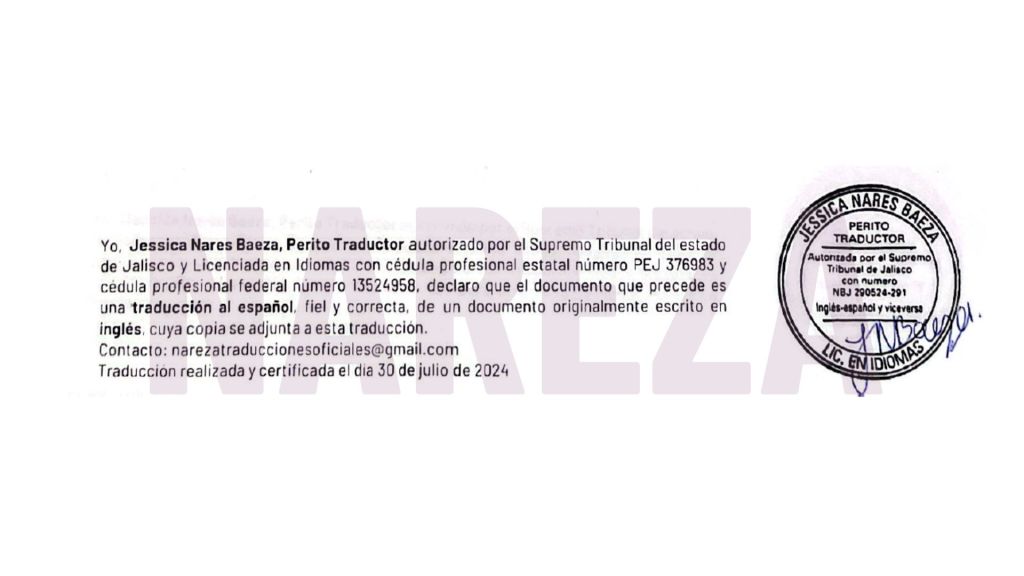 Una traducción certificada cuenta con la certificación o declaración de precisión del Perito Traductor. En el caso de NAREZA, esta se coloca como una leyenda al pie de cada página traducida en donde se incluyen datos como el idioma del documento original y la traducción y otros datos de identificación del Perito, como su nombre, número de cédula profesional y número de autorización otorgado por la autoridad para realizar traducciones oficiales —en NAREZA, contamos con la autorización del Supremo Tribunal de Justicia del estado de Jalisco (STJJ).
